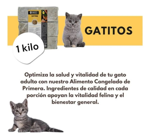 Proporciona a tu gatito una alimentación adecuada y balanceada con el Alimento First Natural Congelado Gatito Kitten de 1kg. Este alimento húmedo es perfecto para gatitos de todos los tamaños y está formulado para satisfacer sus necesidades nutricionales específicas en esta etapa crucial de crecimiento. Con un delicioso sabor mix, tus pequeños felinos disfrutarán de una experiencia de comida irresistible y nutritiva.