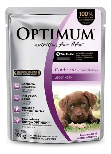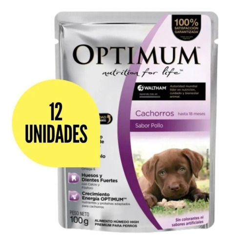Optimum Pouch Perro Cachorro es un alimento húmedo en formato de bolsa, diseñado para satisfacer las necesidades nutricionales de cachorros en crecimiento. Este paquete contiene 12 unidades de 100 gramos cada una, proporcionando una alimentación completa y balanceada para el desarrollo óptimo de tu mascota. Ideal para todas las razas, este producto asegura una dieta rica en proteínas y nutrientes esenciales para la salud y el bienestar de tu cachorro.